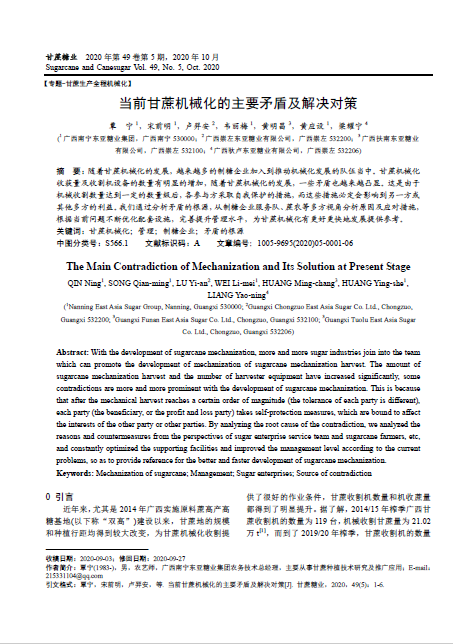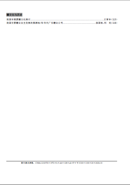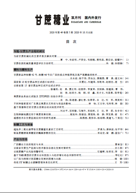 《甘蔗糖業(yè)》創(chuàng)刊于1972 年,由中國輕工業(yè)聯(lián)合會主管,中國糖業(yè)協(xié)會、全國甘蔗糖業(yè)信息中心和廣州甘蔗糖業(yè)研究所主辦,是國內(nèi)甘蔗制糖行業(yè)唯一的全國性科技期刊,是國內(nèi)制糖行業(yè)中創(chuàng)刊最早、覆蓋面最廣的綜合性科技期刊,具權(quán)威性、知識性、可讀性、實用性和前瞻性。被收錄為“中國科技論文統(tǒng)計源期刊”(中國科技核心期刊),并被“萬方數(shù)據(jù)—數(shù)字化期刊群”和《中國核心期刊( 遴選) 數(shù)據(jù)庫》、《中國學術(shù)期刊綜合評價數(shù)據(jù)庫》和《中國科學引文數(shù)據(jù)庫》等相關(guān)數(shù)據(jù)庫收錄,已入編由清華大學主編的《中國學術(shù)期刊( 光盤版)》,曾獲中國輕工總會優(yōu)秀科技期刊二等獎。