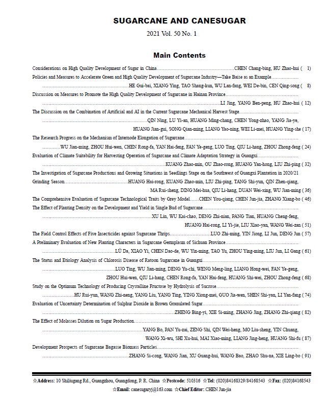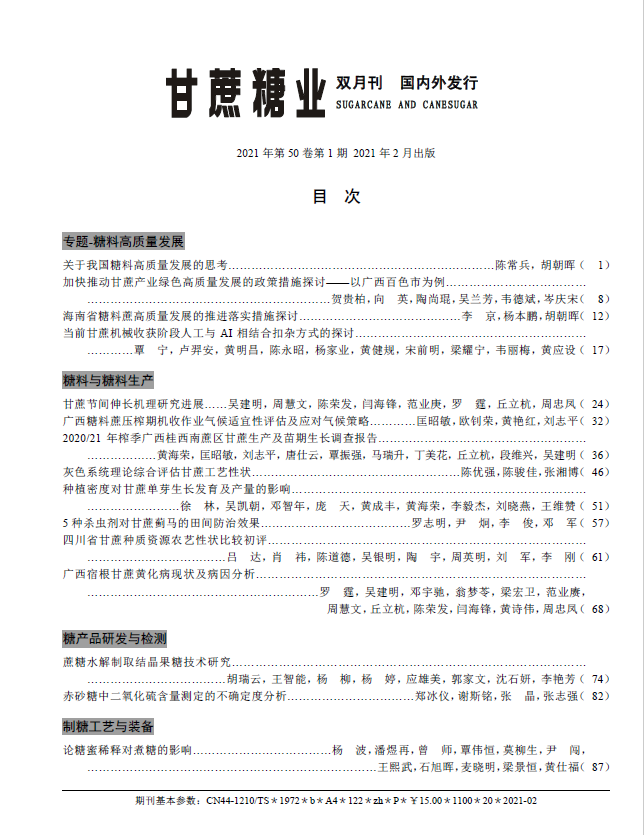 《甘蔗糖業(yè)》創(chuàng)刊于1972 年,由中國輕工業(yè)聯(lián)合會(huì)主管,中國糖業(yè)協(xié)會(huì)、全國甘蔗糖業(yè)信息中心和廣州甘蔗糖業(yè)研究所主辦,是國內(nèi)甘蔗制糖行業(yè)唯一的全國性科技期刊,是國內(nèi)制糖行業(yè)中創(chuàng)刊最早、覆蓋面最廣的綜合性科技期刊,具權(quán)威性、知識(shí)性、可讀性、實(shí)用性和前瞻性。被收錄為“中國科技論文統(tǒng)計(jì)源期刊”(中國科技核心期刊),并被“萬方數(shù)據(jù)—數(shù)字化期刊群”和《中國核心期刊( 遴選) 數(shù)據(jù)庫》、《中國學(xué)術(shù)期刊綜合評價(jià)數(shù)據(jù)庫》和《中國科學(xué)引文數(shù)據(jù)庫》等相關(guān)數(shù)據(jù)庫收錄,已入編由清華大學(xué)主編的《中國學(xué)術(shù)期刊( 光盤版)》,曾獲中國輕工總會(huì)優(yōu)秀科技期刊二等獎(jiǎng)。