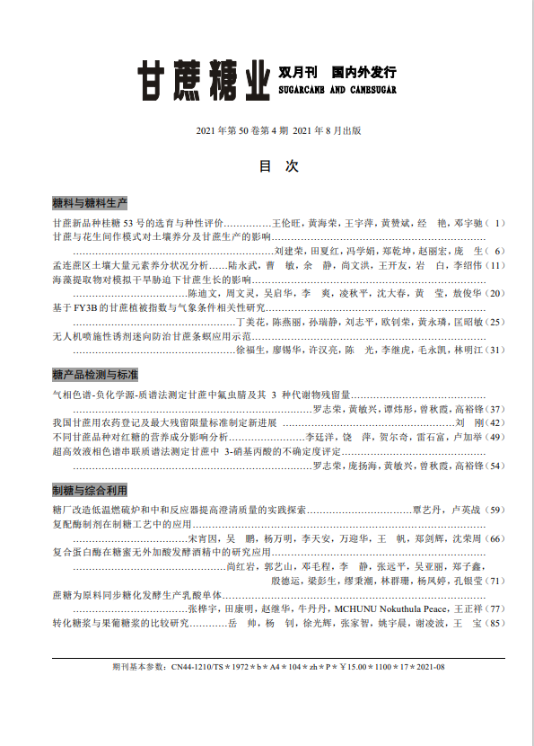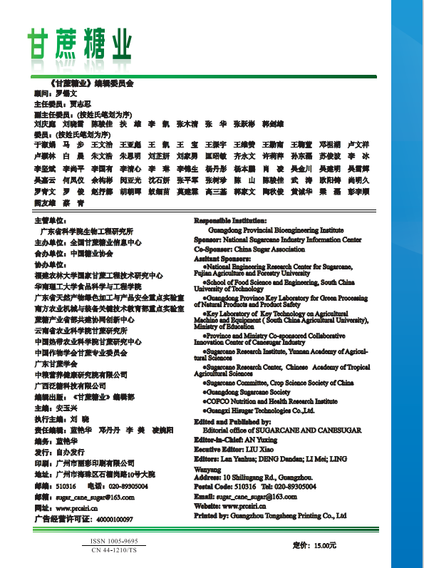 《甘蔗糖業》創刊于1972 年,由中國輕工業聯合會主管,中國糖業協會、全國甘蔗糖業信息中心和廣州甘蔗糖業研究所主辦,是國內甘蔗制糖行業唯一的全國性科技期刊,是國內制糖行業中創刊最早、覆蓋面最廣的綜合性科技期刊,具權威性、知識性、可讀性、實用性和前瞻性。被收錄為“中國科技論文統計源期刊”(中國科技核心期刊),并被“萬方數據—數字化期刊群”和《中國核心期刊( 遴選) 數據庫》、《中國學術期刊綜合評價數據庫》和《中國科學引文數據庫》等相關數據庫收錄,已入編由清華大學主編的《中國學術期刊( 光盤版)》,曾獲中國輕工總會優秀科技期刊二等獎。