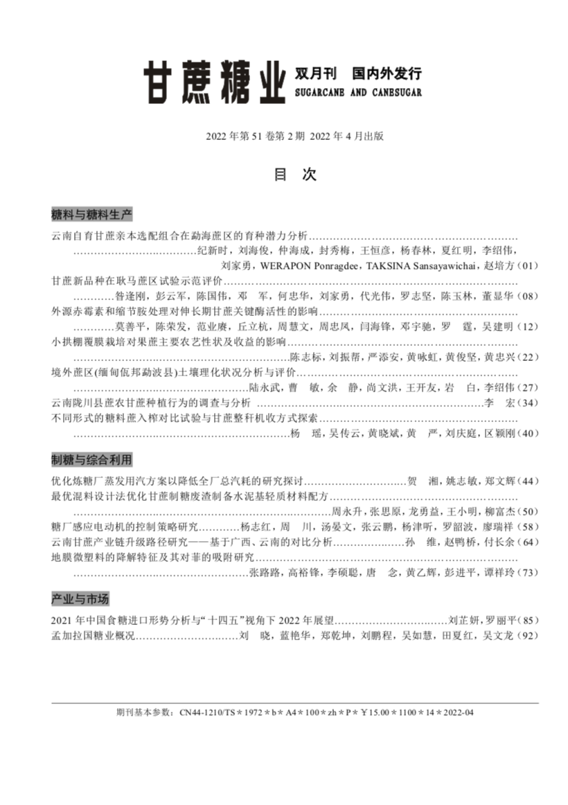 《甘蔗糖業》創刊于1972 年,由中國輕工業聯合會主管,中國糖業協會、全國甘蔗糖業信息中心和廣州甘蔗糖業研究所主辦,是國內甘蔗制糖行業唯一的全國性科技期刊,是國內制糖行業中創刊最早、覆蓋面最廣的綜合性科技期刊,具權威性、知識性、可讀性、實用性和前瞻性。被收錄為“中國科技論文統計源期刊”(中國科技核心期刊),并被“萬方數據—數字化期刊群”和《中國核心期刊( 遴選) 數據庫》、《中國學術期刊綜合評價數據庫》和《中國科學引文數據庫》等相關數據庫收錄,已入編由清華大學主編的《中國學術期刊( 光盤版)》,曾獲中國輕工總會優秀科技期刊二等獎。