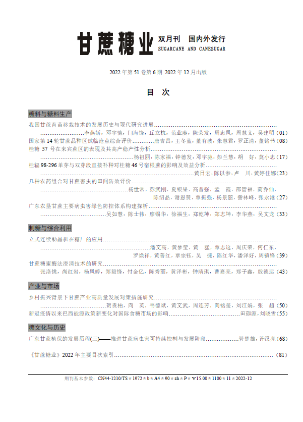 《甘蔗糖業》創刊于1972 年,由中國輕工業聯合會主管,中國糖業協會、全國甘蔗糖業信息中心和廣州甘蔗糖業研究所主辦,是國內甘蔗制糖行業唯一的全國性科技期刊,是國內制糖行業中創刊最早、覆蓋面最廣的綜合性科技期刊,具權威性、知識性、可讀性、實用性和前瞻性。被收錄為“中國科技論文統計源期刊”(中國科技核心期刊),并被“萬方數據—數字化期刊群”和《中國核心期刊( 遴選) 數據庫》、《中國學術期刊綜合評價數據庫》和《中國科學引文數據庫》等相關數據庫收錄,已入編由清華大學主編的《中國學術期刊( 光盤版)》,曾獲中國輕工總會優秀科技期刊二等獎。
