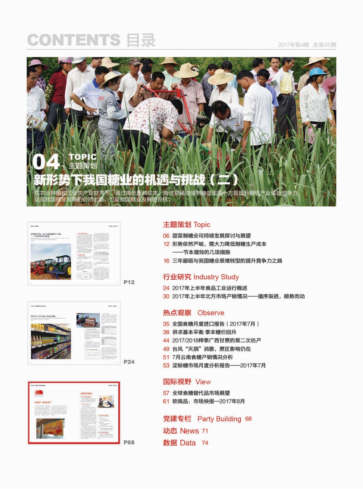 《中國糖業》由中國糖業協會主辦,是面向各級政府主管部門、中國糖業協會會員單位的內部刊物。《中國糖業》為雙月刊,以正確引導輿論方向,提供信息服務為宗旨,深入剖析評介行業發展趨勢、企業的改革與管理、糖業宏觀政策和產業未來規劃、行業重大熱點問題,并及時發布國際國內市場動態、通報協會工作等,力爭通過形式多樣的深度報道,更具專業性、權威性、前瞻性的分析文章,引領廣大讀者及時、快捷的掌握行業動態和發展趨勢。為行業參與各方搭建信息溝通的橋梁,并為其提供全面、細致、專業、權威的信息服務。