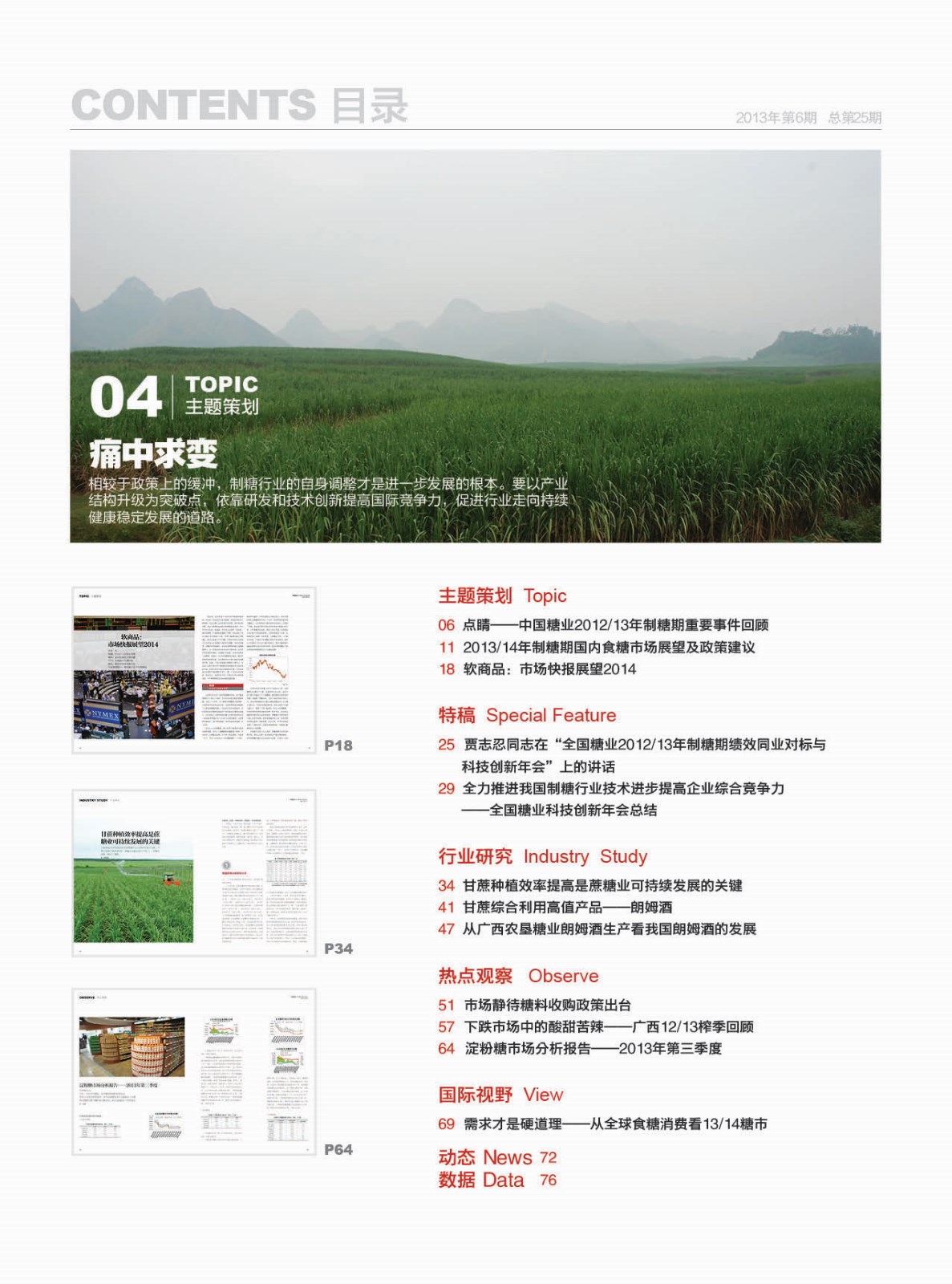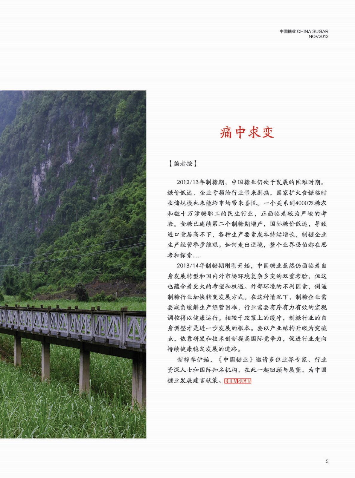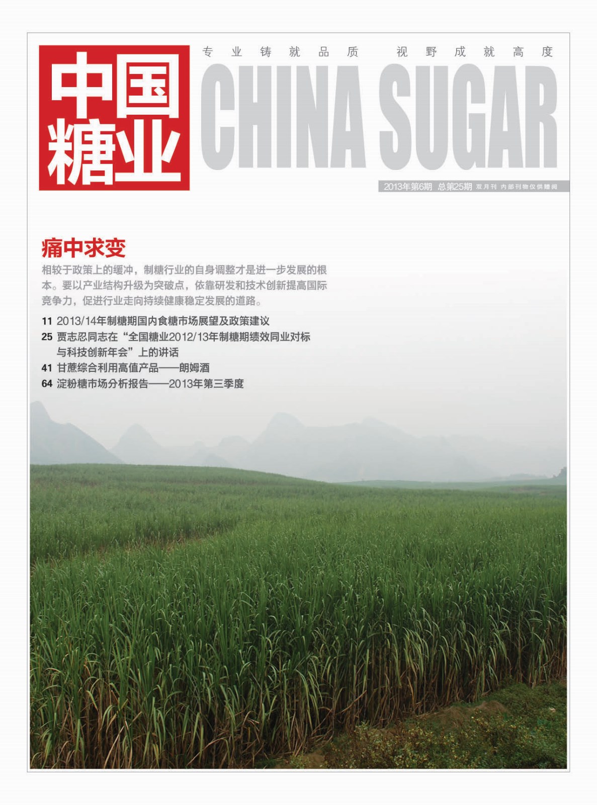 《中國糖業(yè)》由中國糖業(yè)協(xié)會主辦,是面向各級政府主管部門、中國糖業(yè)協(xié)會會員單位的內(nèi)部刊物?!吨袊菢I(yè)》為雙月刊,以正確引導(dǎo)輿論方向,提供信息服務(wù)為宗旨,深入剖析評介行業(yè)發(fā)展趨勢、企業(yè)的改革與管理、糖業(yè)宏觀政策和產(chǎn)業(yè)未來規(guī)劃、行業(yè)重大熱點問題,并及時發(fā)布國際國內(nèi)市場動態(tài)、通報協(xié)會工作等,力爭通過形式多樣的深度報道,更具專業(yè)性、權(quán)威性、前瞻性的分析文章,引領(lǐng)廣大讀者及時、快捷的掌握行業(yè)動態(tài)和發(fā)展趨勢。為行業(yè)參與各方搭建信息溝通的橋梁,并為其提供全面、細(xì)致、專業(yè)、權(quán)威的信息服務(wù)。