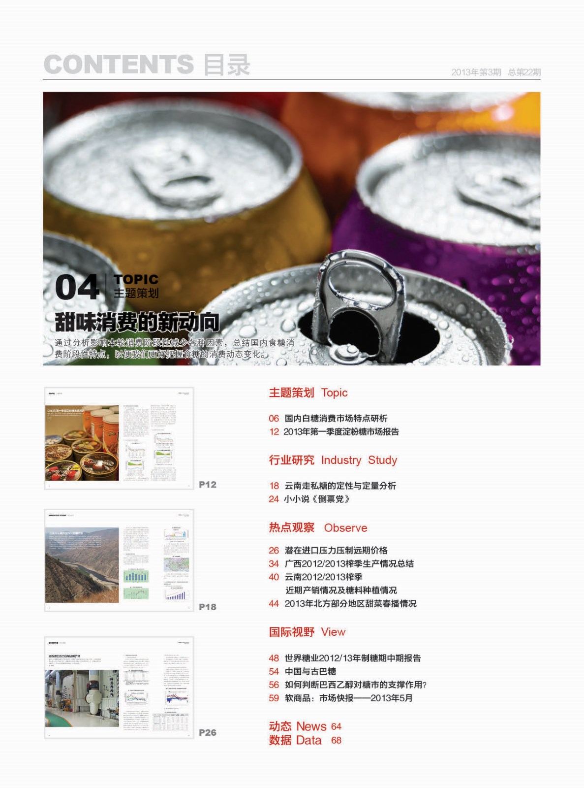 《中國糖業》由中國糖業協會主辦,是面向各級政府主管部門、中國糖業協會會員單位的內部刊物?!吨袊菢I》為雙月刊,以正確引導輿論方向,提供信息服務為宗旨,深入剖析評介行業發展趨勢、企業的改革與管理、糖業宏觀政策和產業未來規劃、行業重大熱點問題,并及時發布國際國內市場動態、通報協會工作等,力爭通過形式多樣的深度報道,更具專業性、權威性、前瞻性的分析文章,引領廣大讀者及時、快捷的掌握行業動態和發展趨勢。為行業參與各方搭建信息溝通的橋梁,并為其提供全面、細致、專業、權威的信息服務。