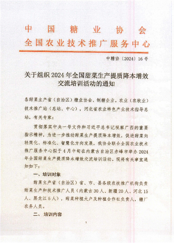 關于組織2024年全國甜菜生產提質降本增效交流培訓活動的通知