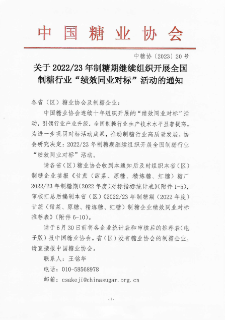 關(guān)于2022/23年制糖期繼續(xù)組織開展全國制糖行業(yè)“績效同業(yè)對標(biāo)”活動的通知