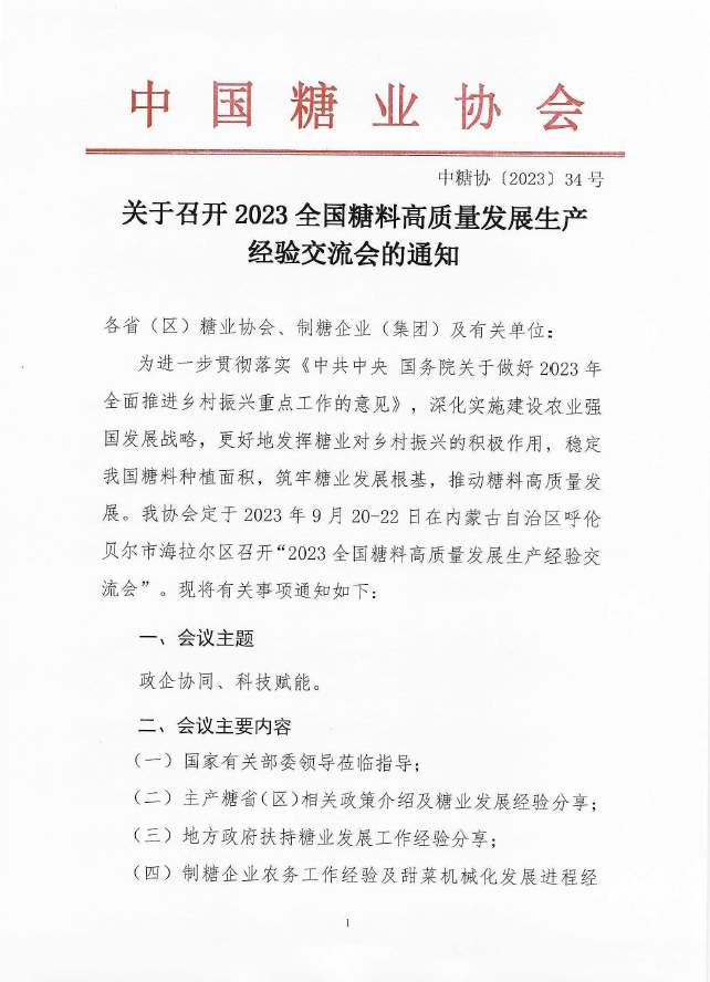 關于召開2023全國糖料高質量發展生產經驗交流會的通知