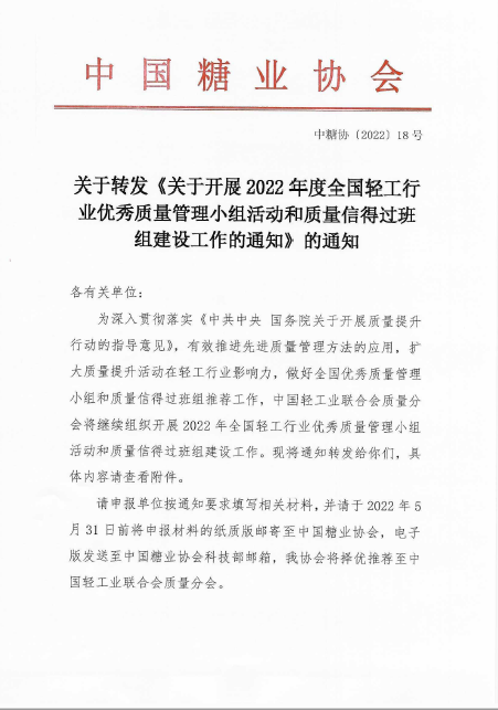 關于轉發《關于開展2022年度全國輕工行業優秀質量管理小組活動和質量信得過班組建設工作的通知》的通知